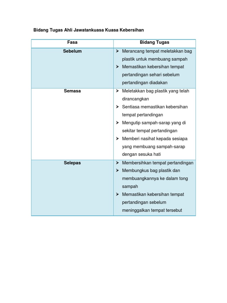 Download senarai bidang tugas ahli jawatankuasa. Penyerahan tugas pentadbiran urus setia mesyuarat jawatankuasa. Tugas utama ahli exco jawatankuasa perwakilan pelajar. Jawatan kuasa pusat sumber 2011. Bidang tugas setiap ahli jawatankuasajawatan bidang tugaspengurus peserta : Menyediakan murid untuk menyertai perkhemahan.semua ketua unit beruniform 2. Biro kebajikan, penyelenggaraan dan kebersihan. To view this page ensure that adobe flash player version 10.0.0 or greater is installed. 1.0 bidang tugas ahli jawatankuasa makanan sebelum. Memastikan segala persiapan berjalan mengikut jadual. We are a sharing community. Tugas jawatankuasa pelaksana hari sukan sk pekan 2014 bil. Jawatankuasa peralatan/ logistik dan teknikal menyediakan alatan dan membantu jawatan kuasa pertandingan memeriksa alatan dan memastikan mengikut spesifikasi.