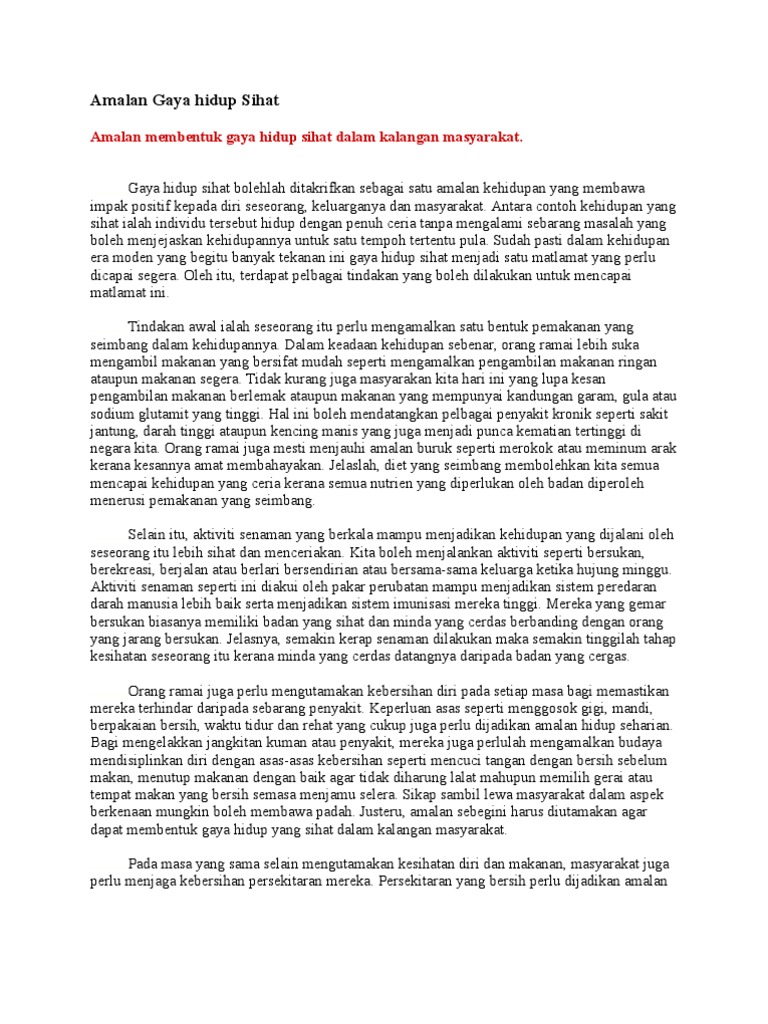 Gaya Hidup Sihat Karangan - Gaya hidup sihat mempengaruhi kejayaan seseorang dalam kehidupannya.jelaskan peranan ibu bapa untuk memastikan ahli keluarga mereka mengamalkan gaya hidup sihat ini.. Setiap individu ingin hidup sihat dari segi fizikal dan mental. Otherwise we shall not be able to keep our mind strong and clear. Learn vocabulary, terms and more with flashcards, games and other study tools. Bukan sahaja kesihatan akan meningkat, produktiviti, ekonomi dan kemakmuran negara juga turut berkembang. Amalan gaya hidup sihat memang banyak kepentingannya kepada manusia.